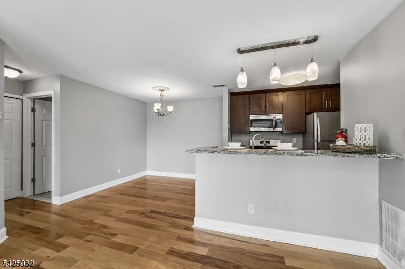 Renovated, light-filled penthouse that truly WOWs! This spacious 1 bedroom, 1 bath, 3rd floor walk up condominium offers an airy, open floor plan with abundant natural light and thoughtful upgrades throughout. The largest 1 bedroom unit of its kind, the Brittany, features: Scandinavian style hardwood floors, upgraded Shaker cabinetry, granite countertops, a breakfast bar with pendant lighting, a formal dining room, pantry and additional storage, a walk-in closet with organizers, an updated full bath, a cozy fireplace, designer and recessed lighting and full-sized front-load washer & dryer. A large private balcony invites sunlight on cooler days and becomes an outdoor retreat when the weather warms. Newer, replacement windows and glass sliding door ensures energy efficiency. The community is beautifully designed with professional, parklike landscaping, swimming pool, tennis courts and commercial grade grilling area. HOA includes water and sewer costs, trash removal, snow removal and lawn/grounds care AND access to all amenities! Close to Route 18 shopping, NJ Transit bus and rails, 1-95 NJ Turnpike and E. Brunswick Blue Ribbon School District. What a turnkey find!