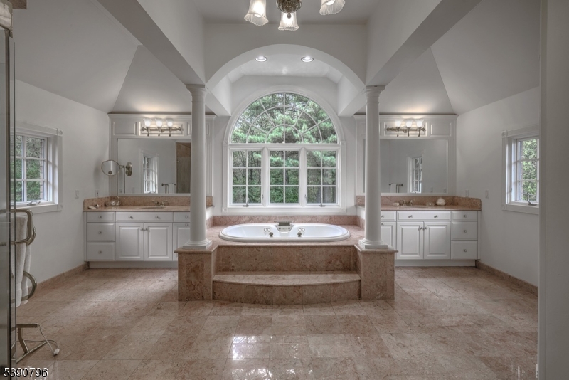 Welcome to Raspberry Hill, a distinguished Federal-style estate designed by Beer & Coleman, set on over five wooded acres in a private Mendham Township cul-de-sac. Crafted with Lafayette jumbo brick, cast stone accents and a striking eight-column Corinthian colonnade, this residence blends architectural elegance with modern sophistication. Double mahogany doors gracefully open to a soaring two-story foyer adorned with marble floors, establishing the grandeur of this magnificent home. Inside, you will find refined details throughout: a cherry-paneled library with Brazilian cherry floors, a sunroom wrapped in windows, formal living room with fireplace, and a two-story great room with French doors to the stone patio. The gourmet kitchen is fitted with Sub-Zero and Viking appliances, a Wolf cooktop, wet bar with brass sink, and custom cherry cabinetry. A formal dining room with oak inlay floors and a medallion ceiling offers the perfect stage for elegant gatherings. Upstairs, the primary suite includes a gas fireplace, spa bath with marble vanities, Jacuzzi tub, and expansive walk-in closet. The finished lower level surprises with a home theater, retro-style diner & gym. Conveniently located with easy access to local amenities and top-rated schools, this exceptional home offers a rare blend of luxury, comfort, and thoughtful design. Surrounded by natural beauty, minutes from top ranked Mendham schools, highways & trains to NYC, parks, golf, and equestrian facilities.